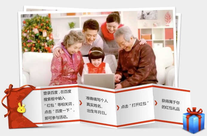 百度投入數(shù)千萬元打造的此次真正零門檻,人人有驚喜的搜紅包活動,將掀起一股強(qiáng)勁的互聯(lián)網(wǎng)應(yīng)用體驗(yàn)浪潮。在百度春節(jié)專題頁面上(http://chunjie.baidu.com)特別設(shè)置的新網(wǎng)民課程,春節(jié)相關(guān)的框計(jì)算應(yīng)用體驗(yàn),百科知道春節(jié)知識集錦等,將讓新老網(wǎng)民的春節(jié)生活別樣精彩?梢哉f,此次大規(guī)模、高投入的互聯(lián)網(wǎng)普及活動,兼具了讓更多人接觸互聯(lián)網(wǎng)、開啟網(wǎng)絡(luò)時(shí)代生活的特殊價(jià)值和意義。