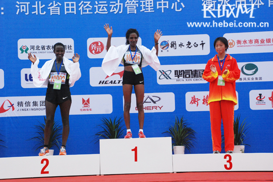 河北選手尹媛媛獲得2012衡水湖馬拉松賽女子全程馬拉松季軍。扈煒 攝